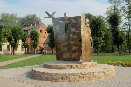 Памятник установлен в августе 2014 года в Саулес дарзс, Бауска. Автор памятника Гиртс Бурвис. В изготовлении памятника использованы разные сплавы металлов, которые при солнечном свете создает интересный визуальный эффект. Памятник создан в виде листа, из которого выходит фигура самого поэта, вылетают лебеди "в солнечную даль", на нем можно прочитать фрагменты стихов поэта.